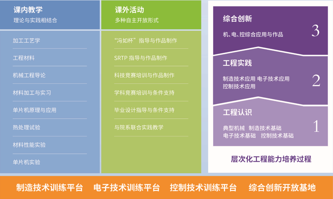 工程训练中心承担培养学生工程素质、实践能力和创新潜质的奠基性和系统性教育责任,以“立足机电控综合平台、面向工程实际、通过创新实践培养工程素质和能力”为教学理念,形成了面向全校各院系的“机、电、控”多学科交叉的基础工程训练平台,构建了基本工程认识、基础工程实践和综合创新训练三个层次的实践教学体系,在学校人才培养中具有重要地位。